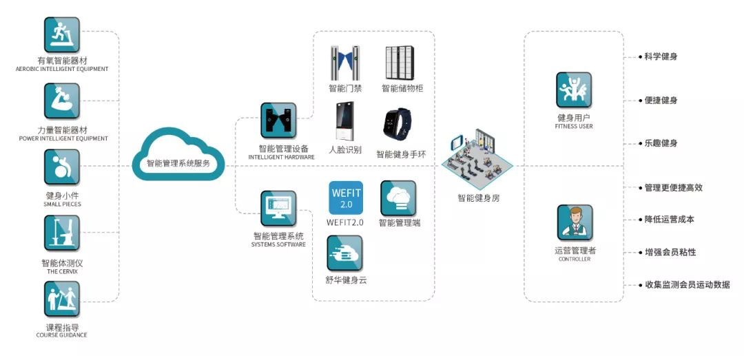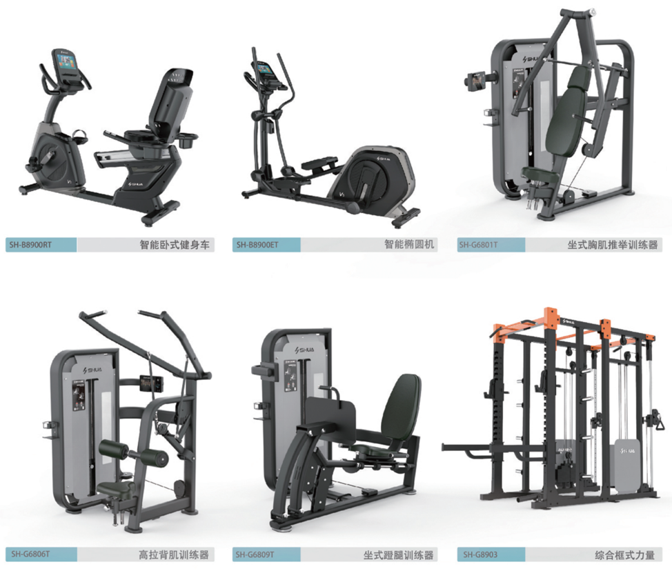 舒华智能健身房器材组成包括:有氧器械、力量器械、功能器械,跑步机、健身车类、力量器材均具有智能触屏及网络系统,与WEFIT和健身房后台相连接。用户通过手机微信扫码或刷手环、刷卡,即可开启健身器材进行使用。